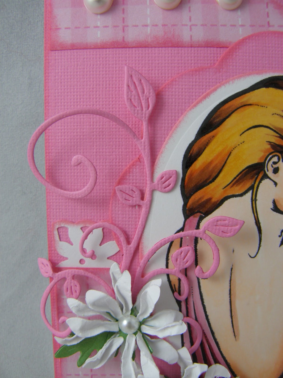 My image is Mary Margaret by Michelle Perkett. I love Michelle's warm, whimsical style. I colored Mary Margaret with Copics, then fussy cut her. I matted her useing SB Labels 4 and Gold Labels 4. I accented the cut with some tiny black gemstones.